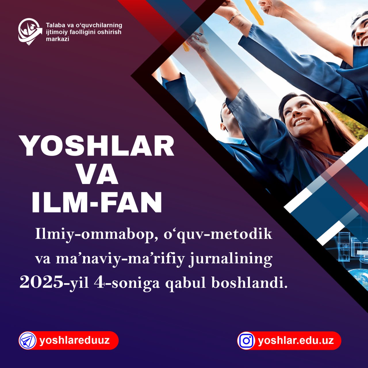 Oliy ta’lim, fan va innovatsiyalar vazirligi Talaba va o‘quvchilarning ijtimoiy faolligini oshirish markazi tomonidan tashkil etilgan “Yoshlar va ilm-fan” ilmiy-ommabop, o‘quv-metodik va ma’naviy-ma’rifiy jurnalining 2025-yil 4-soniga maqolalar qabul qilish boshlandi.