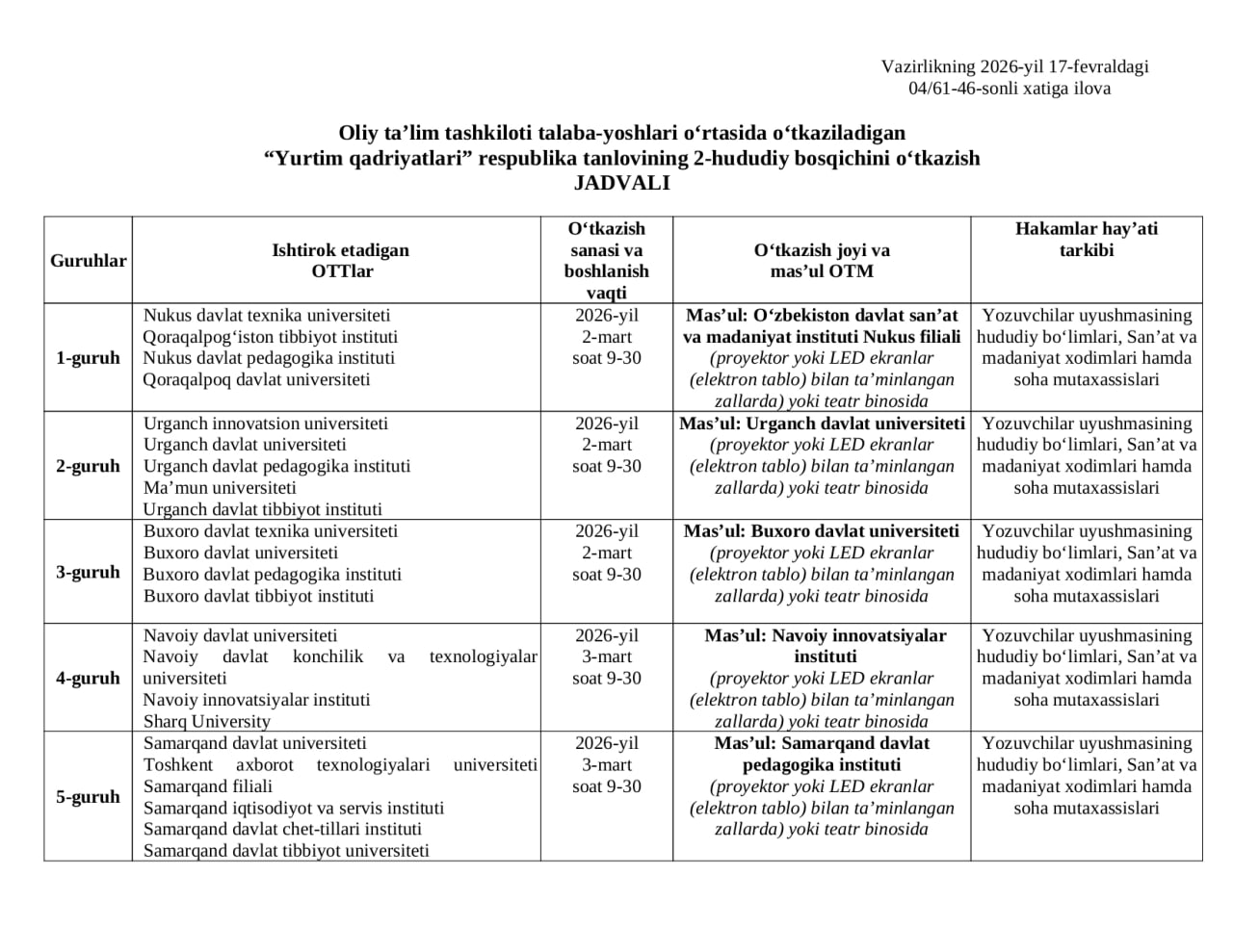 O‘zbekiston Respublikasi Oliy taʼlim, fan va innovatsiyalar vazirligi hamda O‘zbekiston Yozuvchilar uyushmasining 2024-yil 9-oktabrdagi qo‘shma qaroriga muvofiq, oliy ta’lim tashkilotlari talaba-yoshlari o‘rtasida “Yurtim qadriyatlari” respublika tanlovining 2-hududiy bosqich bellashuvlari 2-martdan 13-mart kuniga qadar bo‘lib o‘tadi.